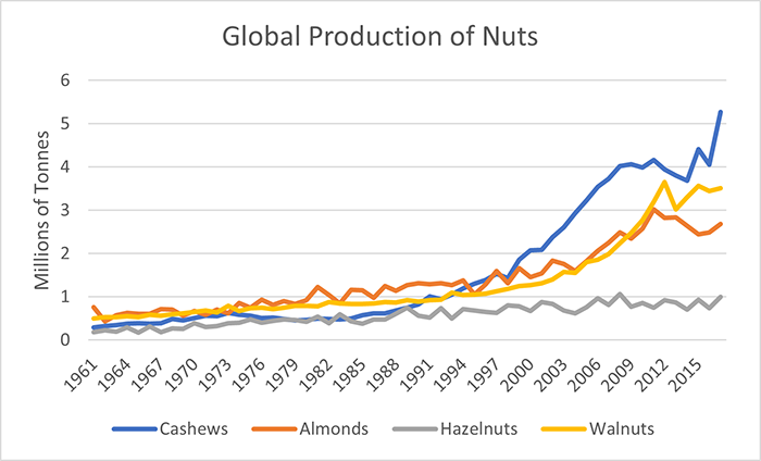 Global demand for cashew nuts has increased over the years, and this should not be surprising: there are many more mouths to feed and improvements in living standards means that many more people can now purchase expensive foods. What is surprising is the rate at which cashew production has increased: 32% between 2010 and 2017.