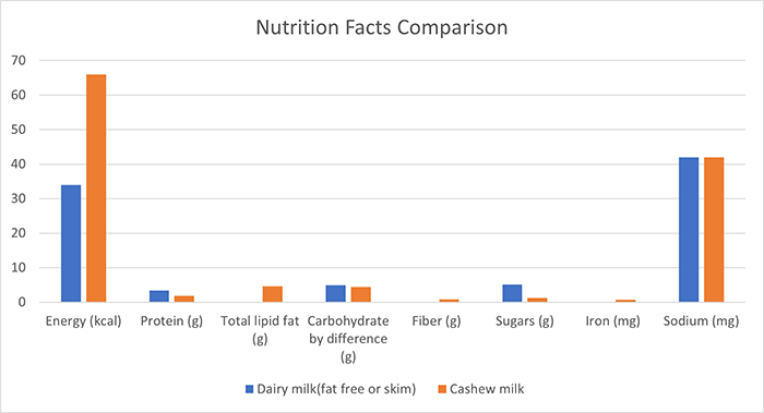Alright, we’re seeing this swap for cashew alternative dairy products, but the big question is: will cashews and other nut milks ever fully displace dairy milk? Many people who are making the switch to plant-based diets are using cashew products as an alternative to dairy products, but these two categories of products do not have the same nutritional value. When comparing the nutritional values of fat free or skim milk to the nutritional values of cashew milk on the USDA FoodData Central website, I found that cashew milk has more calories, less calcium, and less sugar than dairy milk (8, 9). Other nutritional categories were relatively similar (8,9). These milks cannot be completely substituted for each other, but they remain “close enough” in texture, and are easily substituted in recipes, smoothies, or cereal.