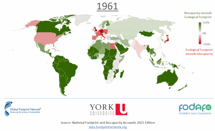 Diving deeper, let’s take a closer look at Ecological Footprint and biocapacity, but at the country level. Ecological Footprint is associated with the residents of a country, while biocapacity is associated with the country’s bioproductive surface areas. These areas include land, inland water, and marine areas that a country has rights to, or its exclusive economic zone (EEZ). In the map below—click it to see in animate from 1961 to 2017—countries in green run a biocapacity reserve; their residents consume less than their ecosystems can regenerate. Countries in red run a biocapacity deficit; their residents consume more resources than their ecosystems can regenerate.