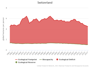 In Ecological Footprint and biocapacity accounting, being in the red doesn’t automatically mean that you’ve polluted or clearcut forests. For example, Switzerland runs a biocapacity deficit. The Swiss require roughly 4.5 times Switzerland’s biocapacity to support the consumption of Swiss residents. However, Switzerland is known for its beautiful Alps, fresh air, and clean water. Even though Switzerland runs a biocapacity deficit, the physical manifestation of environmental damage does not necessarily occur in Switzerland. The country and its residents can do this by purchasing goods from outside the Swiss borders instead of cutting down their trees and polluting their environment. This is trade. The global market allows us to trade goods and services in a way that optimizes the production and consumption of resources for everyone’s benefit (or at least this is the hope).
