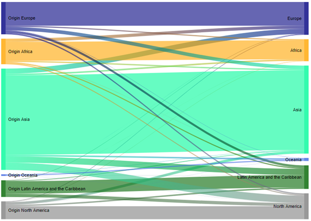 Tracking trade is key to understanding which countries are the ultimate producers and consumers of biocapacity. In order to achieve this, we use IO (input-output) data from our Ecological Footprint extended MRIO model, which can help us trace the flow of biocapacity through the global economy. Every single pair of countries in our database has an associated flow of biocapacity between them. One way to represent this overwhelming amount of data is by using a Sankey diagram. For example, the figure below shows the flow of crop biocapacity after all countries have been aggregated into continents.