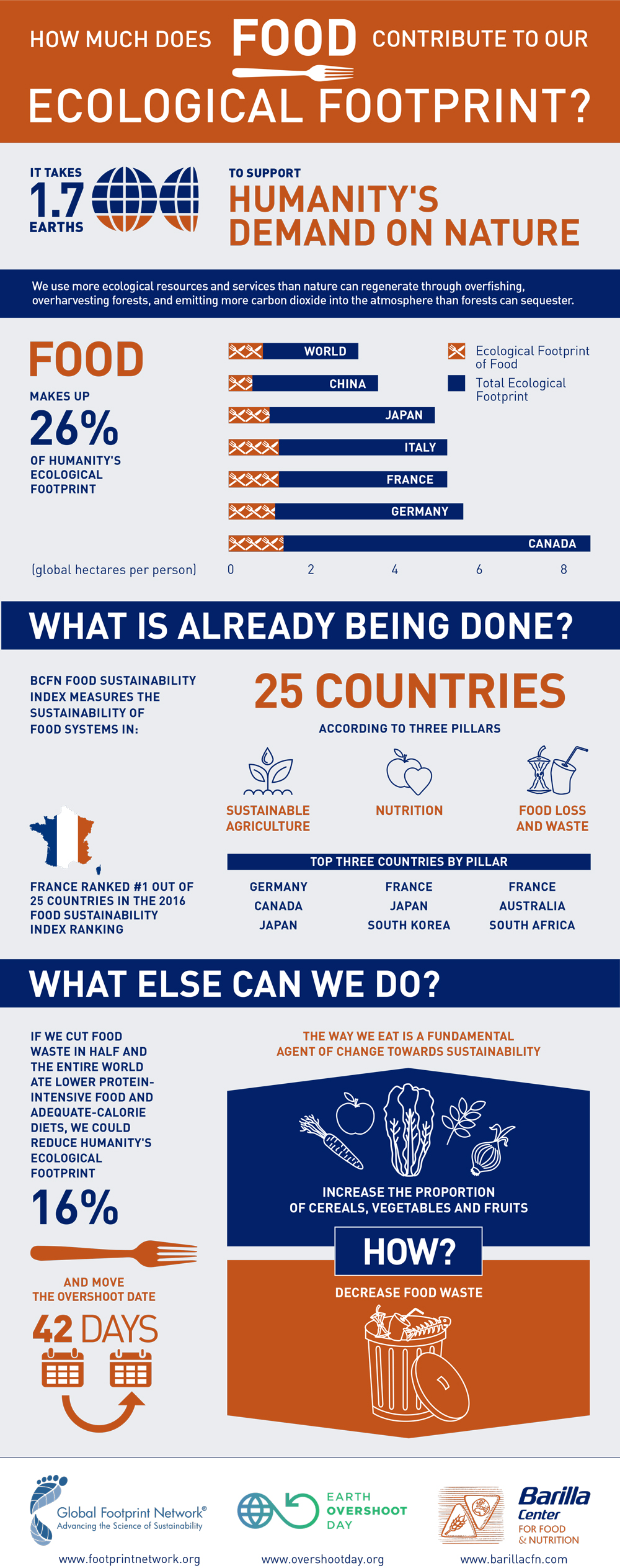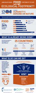 Food is another major Ecological Footprint driver. This year, Global Footprint Network collaborated with the Barilla Center for Food & Nutrition to create an infographic that showcases food-based solutions to lower the Ecological Footprint. Cutting food waste in half worldwide could move the date of Overshoot Day 11 days; eating less protein-intensive food worldwide could move Overshoot Day 31 days. A list of existing solutions that can collectively get us out of overshoot is available here.
