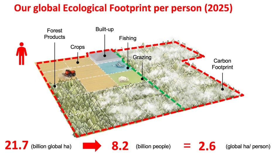 Humanity demands goods and services from nature that require 21.7 billion global hectares to renew them, as of 2025. This is more than the 12.2 billion global hectares of biologically productive area (or biocapacity) available on the planet. Excessive demand means that humanity, by now, uses 1.8 times more than the amount the biosphere currently renews. Some describe this level of consumption as using 1.8 Earths. For maintaining robust biodiversity and climate, ecologists estimate that humans should not demand more than half of the biocapacity on Earth, or over 3 times less than the current demand. (We gratefully acknowledge Foster+Partners for producing the initial version of this illustration).