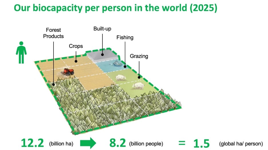 Given the 12.2 billion hectares of biologically productive area on our planet and 8.2 billion people in 2025, this means that there were 1.5 global hectares of biocapacity per person on Earth. (We gratefully acknowledge Foster+Partners for producing the initial version of this illustration).