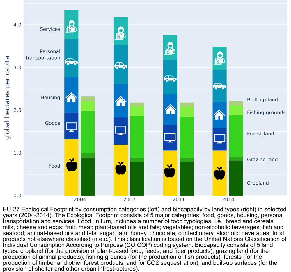 Humanity’s demand for biological resources and ecosystem services far exceeds the planet’s capacity to regenerate biological resources and sequester carbon dioxide emissions, as shown by the progression of Earth Overshoot Day. Similarly, and for the data analysed in the study, the Ecological Footprint of EU-27 residents constantly exceeded the region’s biocapacity and depended upon resources from outside the region to meet EU lifestyle demands.