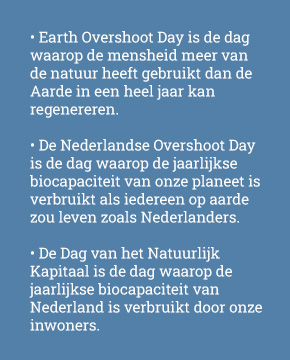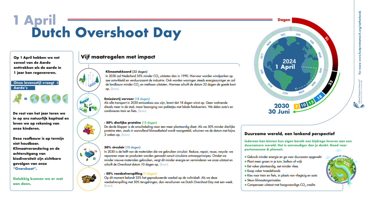 Dutch Overshoot Day is de dag waarop de jaarlijkse biocapaciteit van onze planeet zou zijn verbruikt als iedereen op aarde zou leven zoals de Nederlanders. Voor 2024 valt deze dag op 1 april.